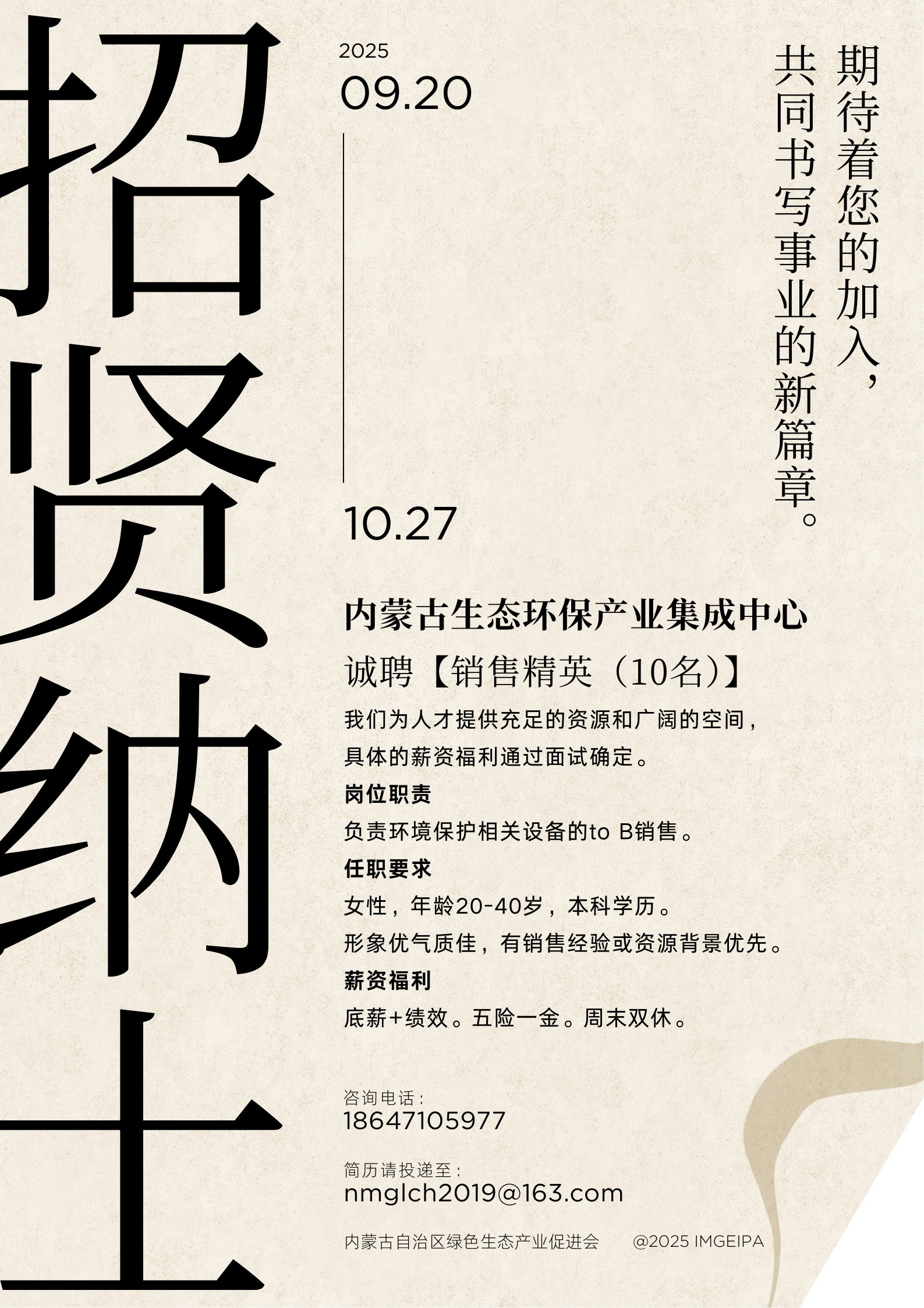 诚聘英才|内蒙古生态环保产业集成中心招聘销售精英