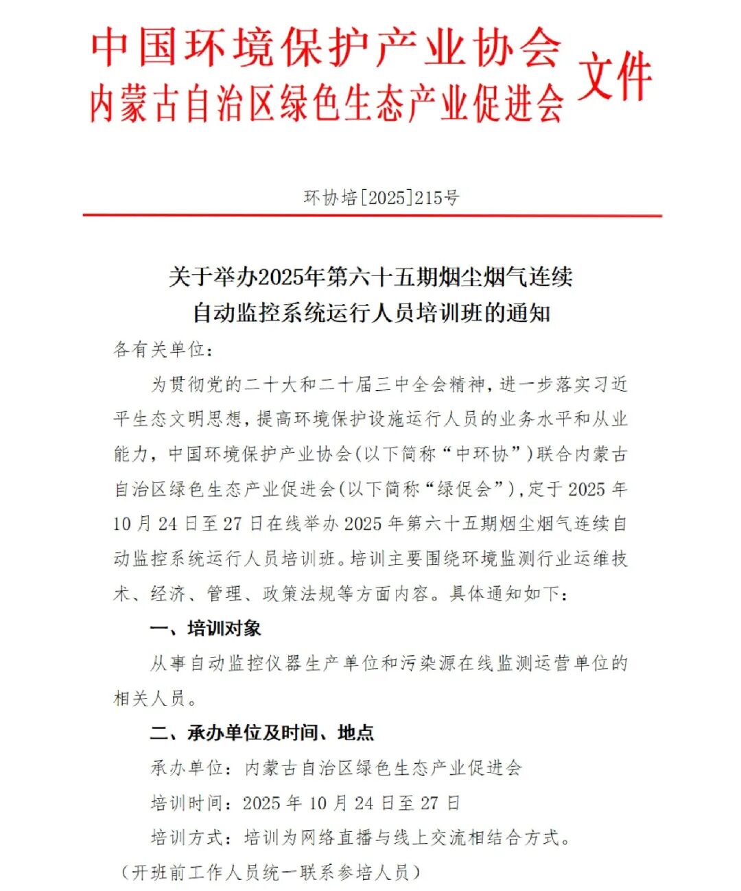 关于举办2025年第六十五期烟尘烟气连续自动监控系统运行人员培训班的通知