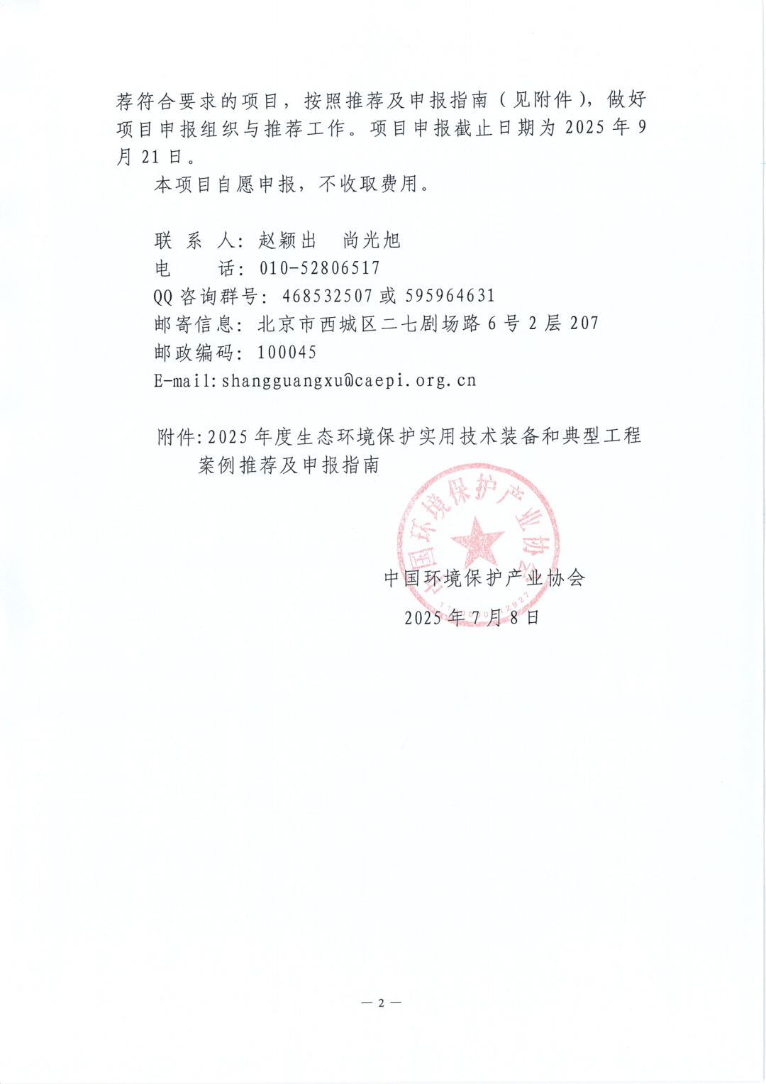 发表时间:2025-08-18 16:40 根据中国环境保护产业协会《关于2025年生态环境保护实用技术装备和典型工程案例推荐工作的通知》(中环协〔2025〕30号),我会组织开展2025年生态环境保护实用技术装备和典型工程申报推荐工作。按照通知要求,呼和浩特市环境保护产业协会作为推荐单位,为各申报单位提供网上申报账号,请申报单位于9月17日前完成填报并将纸质材料(A4纸胶装成册一式二份)加盖公章后报送协会专家委员会。 联系人:李晓丹 电 话:15148651113 地 址:内蒙古呼和浩特市新城区成吉思汗东街荣丰科技B1号楼6楼 附件:《关于2025年生态环境保护实用技术装备和典型工程案例推荐工作的通知》(中环协〔2025〕30号) 2025年7月17日 ![]() ![]() |